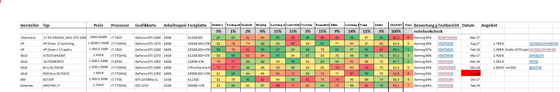 Wer genauer hingeschaut hat, hat bemerkt, dass das HP Omen XP in meinem Geizhals Angebot nur die Geforce 1070 (Im Test von notebookcheck wurde getestet mit der 1080) hat. Damit kann ich natürlich auch nicht 1 zu 1 die Leistungswerte vergleichen und meine Exceltabelle hinkt.