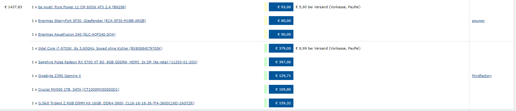 das PP11 CM 600W ist für den preis mMn ne schlechte empfehlung und der RAM ist extrem teuer. wenn der noch bis ans absolute maximum übertaktet werden soll kann man den nehmen, andernfalls mMn verschwendung. und wenn man aus der kiste noch das letzte fps rausprügeln will sollte man ein MB mit besseren VRMs nehmen, erst recht in kombination mit ner AiO.Ich empfehle dir das.