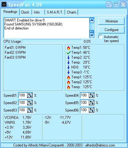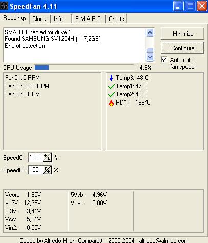 Natürlich voller Panik, weil mein Rechner halt erst 2 Wochen alt ist, habe ich mir mal dieses SpeedFan gezogen und ich musste sehen, das meine (Samsung)Festplatte mit 188° angegeben ist O-o