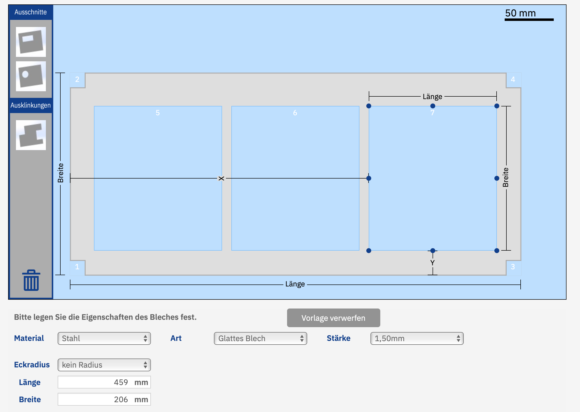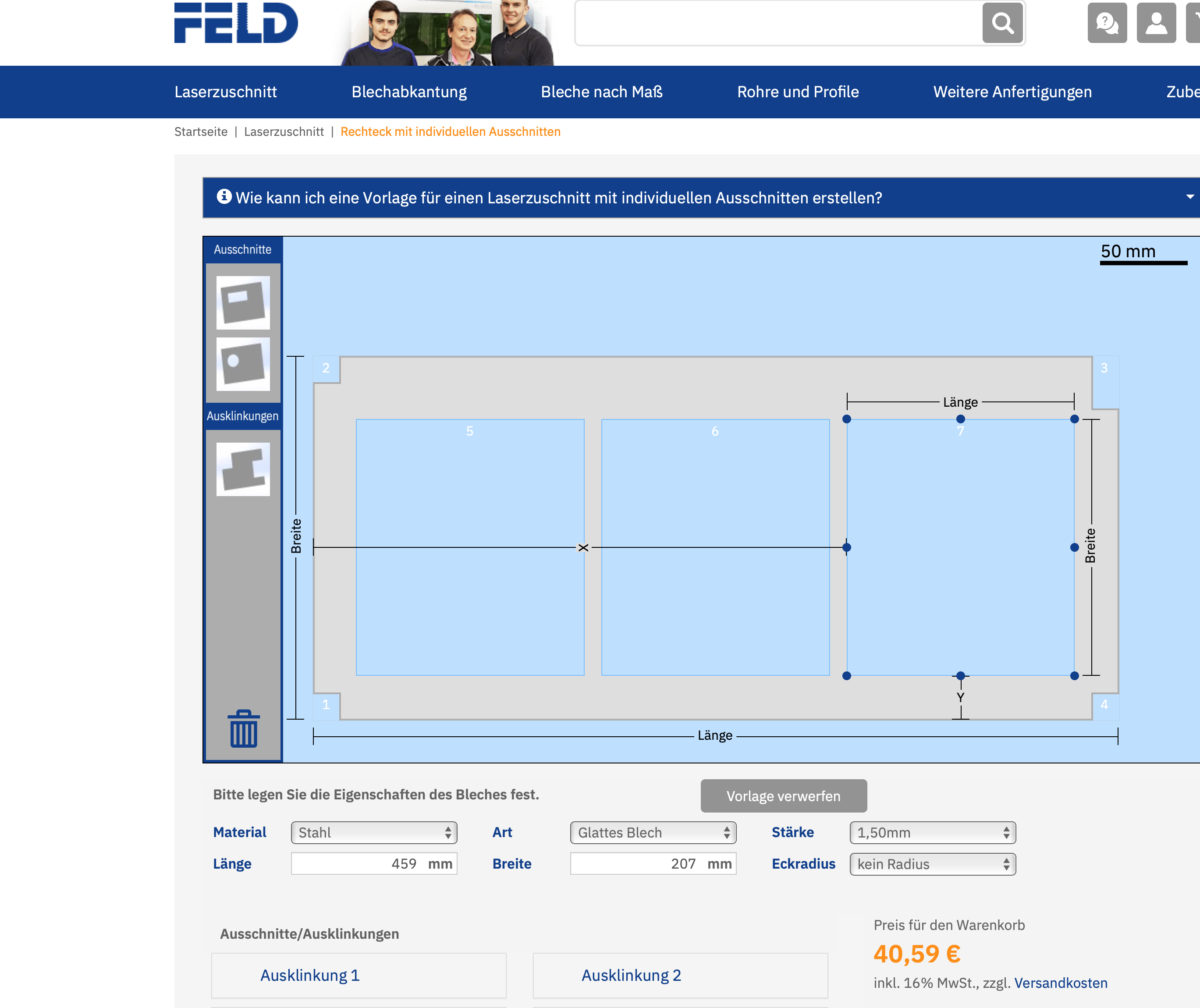 Wenn das Abkanten der Seitenteile von Feld erledigt werden soll, muss dies per Mail geklärt werden da im Konfigurator keine Abkantfunktion hinterlegt ist!
