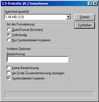 "Vollständig" formatiert den kompletten Speicherbereich und zeigt eventuelle Fehler an (In diesem Fall sollten Sie eine andere Diskette verwenden). Ob Sie den Datenträger benennen möchten, oder einen Abschlussbericht der Formatierung möchten, bleibt Ihnen überlassen.