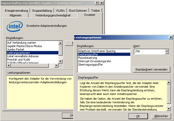 Was ich noch machen könnte wäre ein Test über ftp, habe das aber bisher noch nicht eingesetzt. Hat da wer eine Idee womit ich das recht einfach aber effektiv testen könnte? Weiters werde ich mich vl. noch mit den Intel-Treibern auseinander setzten und vl. die Puffer anpassen (siehe 3. Screenshot). Wenn aber jemand noch Ideen hat was ich Testen könnte, woran das liegt und/oder wie man das Problem lösen kann wäre ich äusserst dankbar.