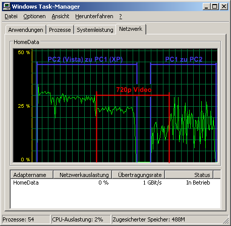 Aktuell kann ich jedenfalls auf meine Freigaben zugreifen, Daten transferieren etc. Das einzige Problem das ich jetzt noch habe ist ist die Geschwindigkeit im LAN. Diese liegt in beiden Richtungen im Schnitt bei ca. 30% Auslastung. Insbesondere mein RAID auf dem PC2 sollte das Netzwerk aber voll auslasten und die Systemplatten auf beiden PCs sollten theor. 70-80% schaffen. Meine Vermutung geht mal in Richtung Vista. Zunächst aber einmal meine bisherigen Versuche: