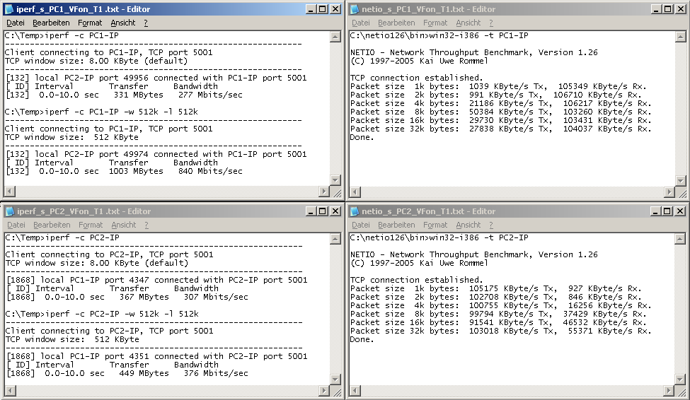 - Auf beiden Rechnern die interne FW (ja ich ich weiß, für gewisse Einschränken brauch ich sie aber) und Virenscanner deaktiviert. Hat 1-2 % ausgemacht.