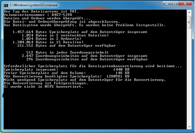 Dann kommt der Befehl convert laufwerk: /fs:ntfs .... Statt Laufwerk gibst Du natürlich den entsprechenden Laufwerksbuchstaben ein. Dadurch wird eine Konvertierung von FAT32 nach NTFS ohne Datenverlust durchgeführt. Der umgekehrte Weg von NTFS nach FAT32 geht nicht ohne Datenverlust.
