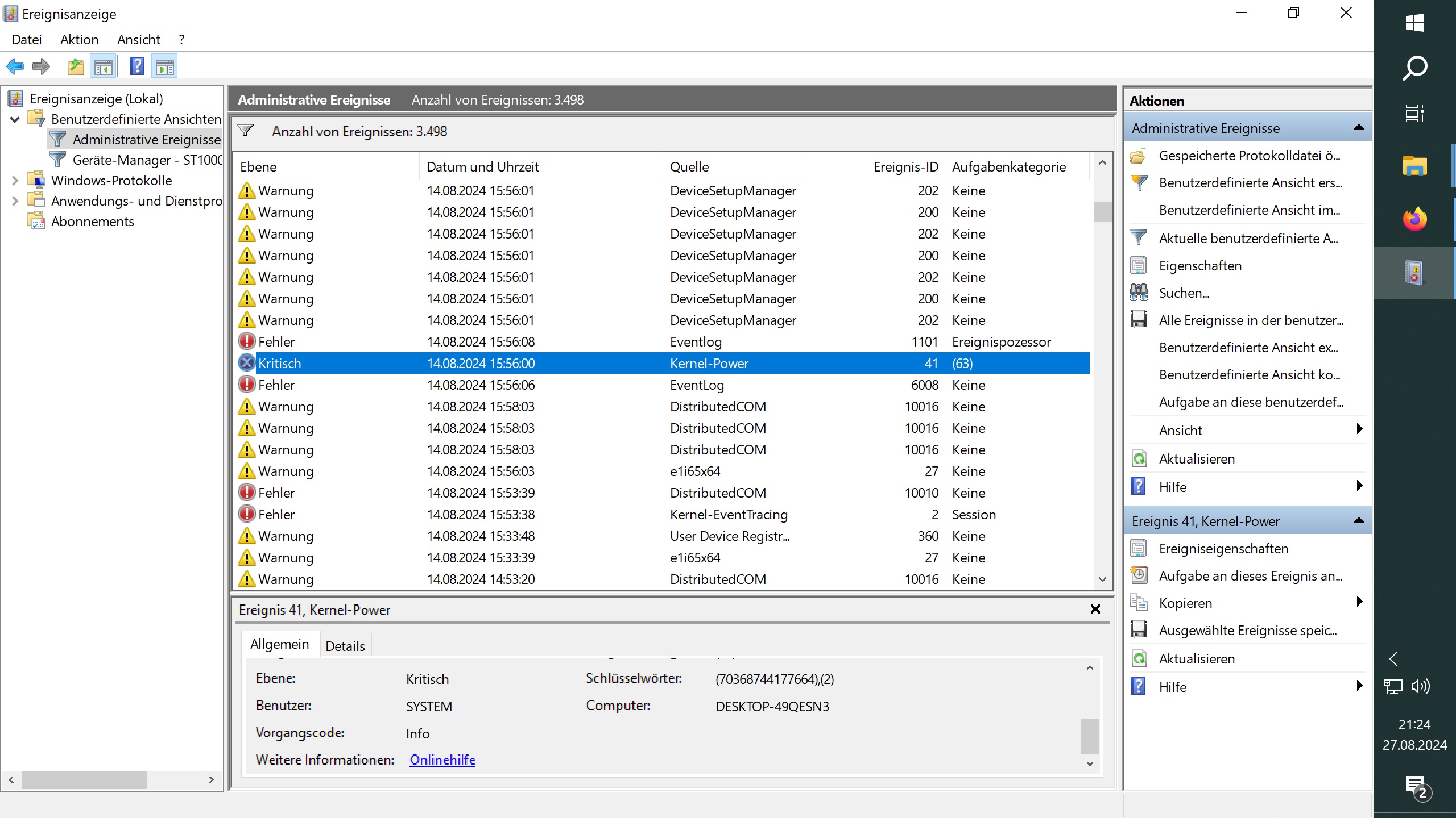 Ereignisanzeige zu dem Zeitpunkt, müsste könnte der Punkt sein, sehr viel Kram da drin, keine Ahnung ob das der Ursachenfindung dienlich sein kann..