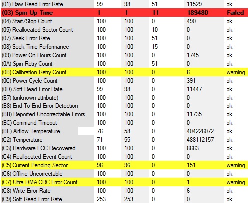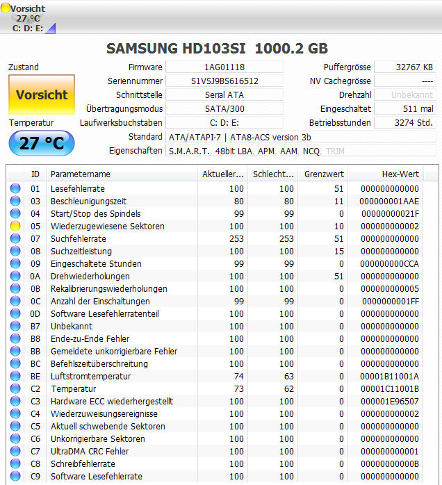 Da ich Angst um ein paar Daten habe, nehm ich die Platte raus und schließe sie per E-SATA an mein Notebook an. Wieder rattert die Platte ungf. eine Minuten, bevor mein Notebook sie als Datenträger erkennt und sie dann wieder die normalen Geräusche von sich gibt. Nur mit Zugriff sieht es schlecht aus. Während sich einige Daten problemlos öffnen lassen, verweigern andere das wieder mal mit unendlichen Wartezeiten. Auch das Programm "Intel Rapid Storage" meint der Zustand der Festplatte währe "kritisch". (Was auch immer es darunter versteht).
