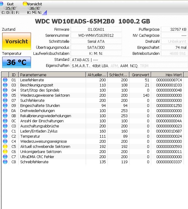 Als nächstes habe ich dann die WD-1TB HDD in meinen Zweitrechner gepackt (Sata 1 war von einer baugleichen WD 10EADS belegt, die angeschossene kam auf Sata 2), um möglichst direkt weiter arbeiten zu können (dort sind meine wichtigsten Daten und Programme verstaut).