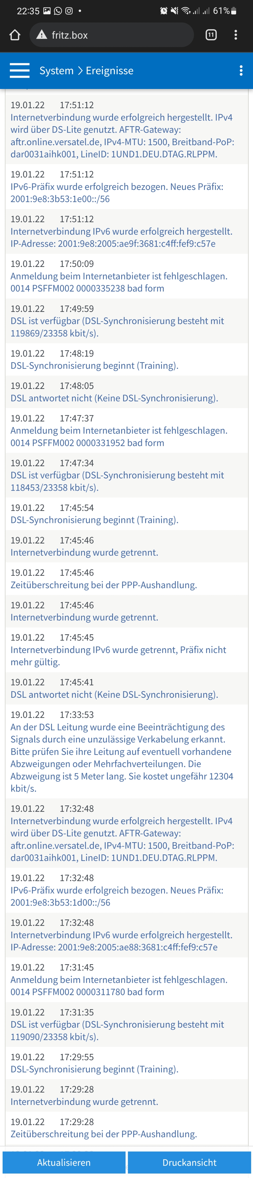 19.01.222 0:51:20I nternetverbindung IPv6 wurde getrennt, Präfix nicht mehr gültig.