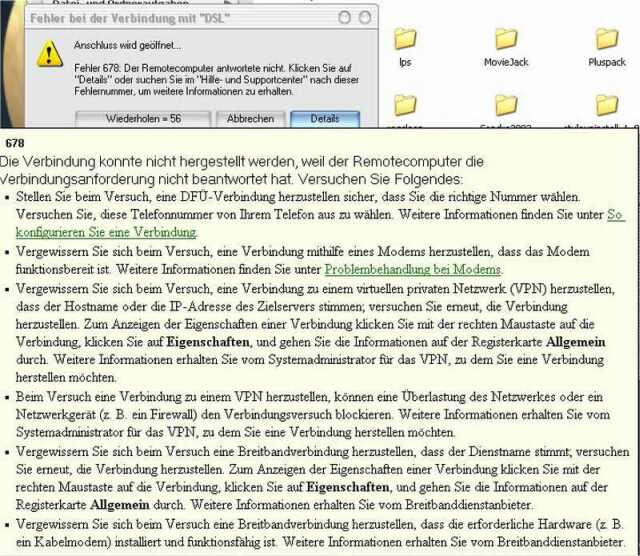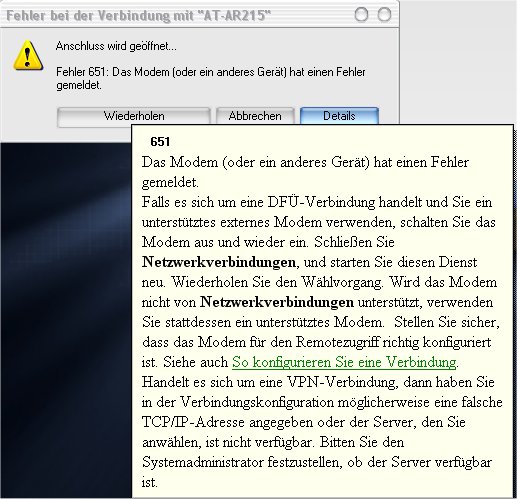 nachdem alles installiert war wollte ich verbinden.hab das passwort mit.... @online.de und ohne eingegeben.aber nicht geht nur das power led leuchtet.hab das passwort mit dem . in der mitte eingegeben stimmt das?habe eine telefon anlage und das heisst ich muss ne 0 davor eingeben aber wo?wie ist die nummer für dsl bei 1und1?der sppedmanager von tonline erkennt nur meine normalen netzwerkkarten aber nicht mein usb modem.hier noch 2 fehlermeldungen einmal bei der standard verbindung und einmal wenn ich selber ne dfü verbindung erstell.