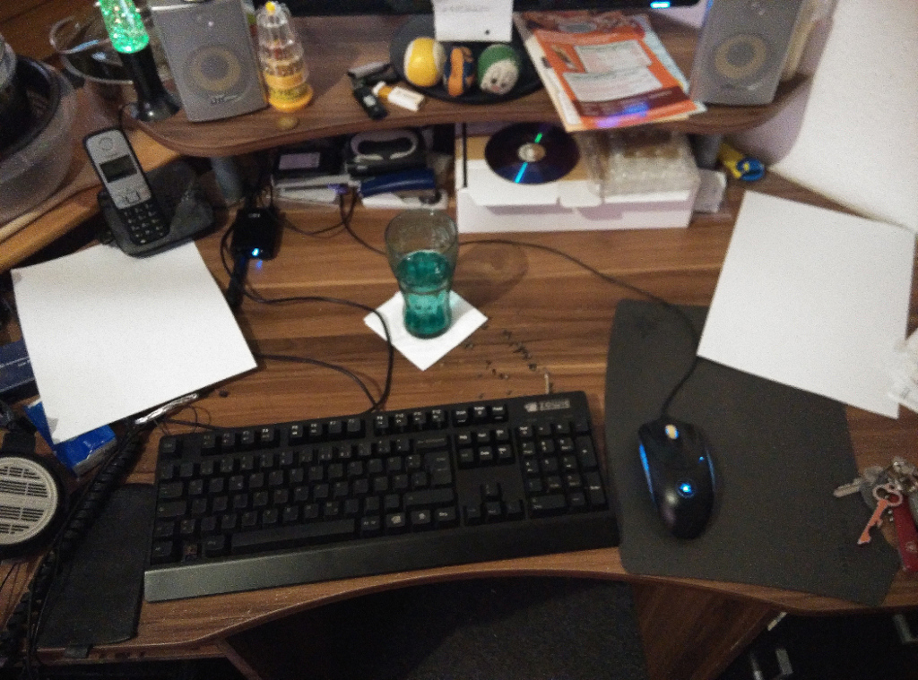 Die Boxen sollen dort stehen, wo die beiden A4-Blätter liegen, was also etwa eine maximale Grundfläche von jeweils 25*30cm ergibt, wobei die linke Box ziemlich frei steht und die rechte mit einer Kante an die Wand anstößt. Dass das nicht optimal ist, ist mir bewusst, aber anders lässt sich das nicht wirklich realisieren.