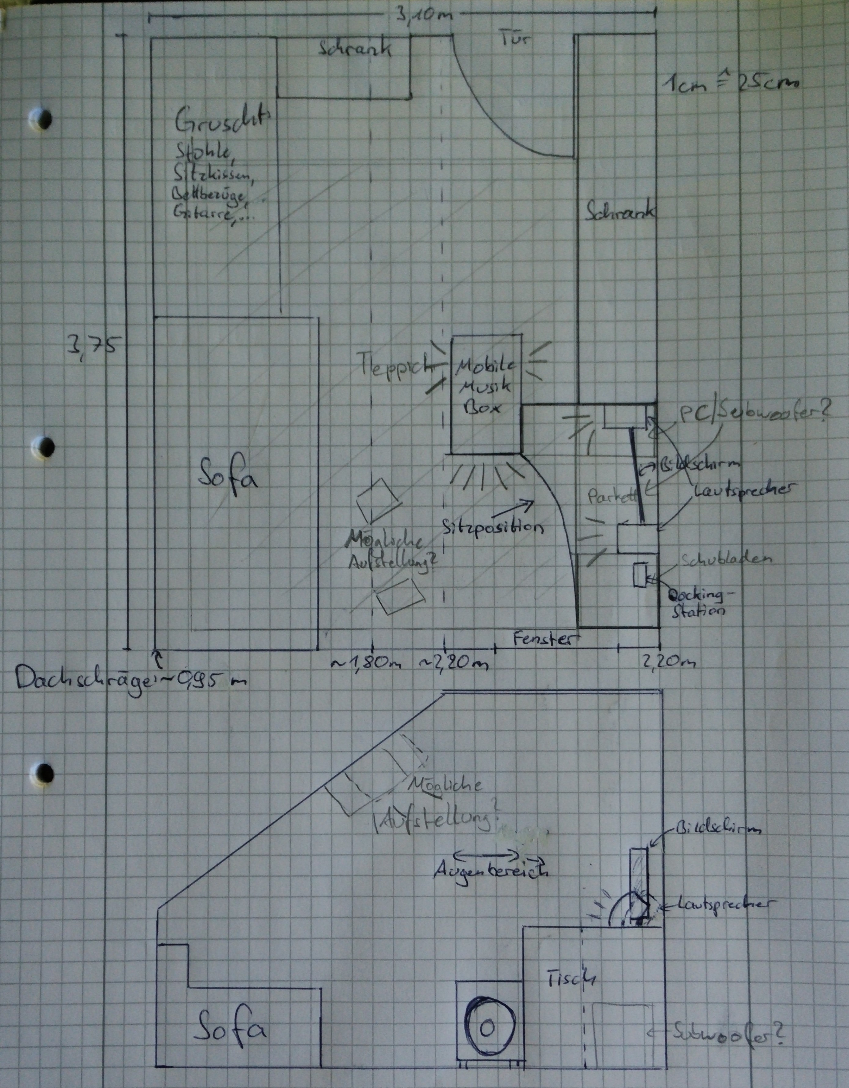 - Das Shema meines Zimmers findet sich im Anhang, wo auch mit Bleistift mögliche Standorte der Surround-Boxen eingezeichnet sind, alternativ, könnte ich auch versuchen diese wie im Bild auf der Seite hier beschrieben aufzustellen http://www.av-wiki.de/aufstellung, jedoch kann sich die Befestigung des rechten Lautsprechers als problematisch ergeben, da er dann an der Wand befestigt werden müsste und fast den halb so weit von mir entfernt wie der linke Lautsprecher wäre