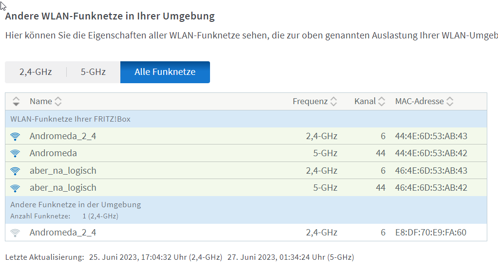 Vor eignen Jahren habe ich dann auch noch 2,4Ghz --> "Andromeda_2_4" einrichtne müssen, da viele Smarthome-Geräte die dazukamen nur über 2,4Ghz kommunizieren können.
