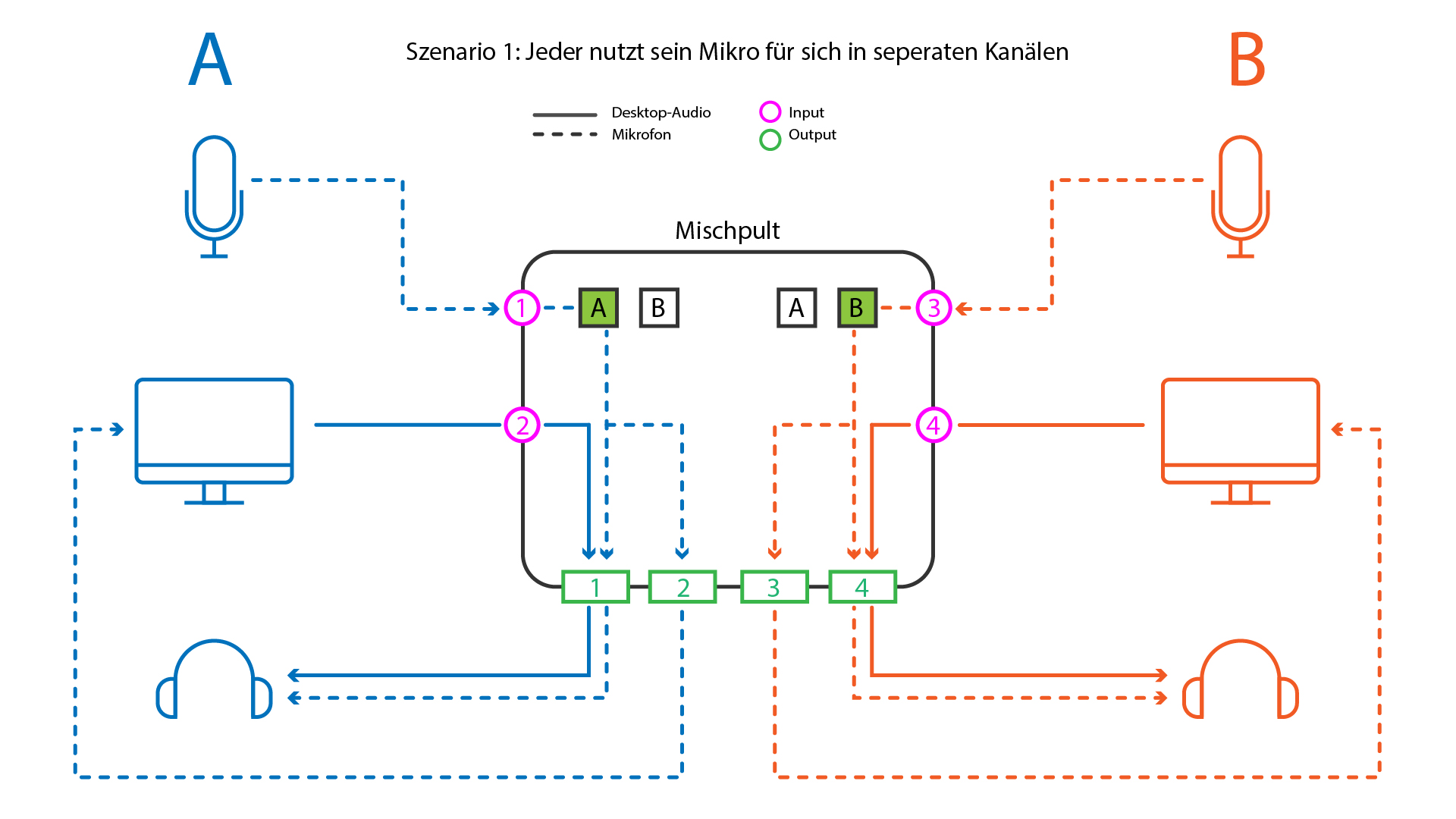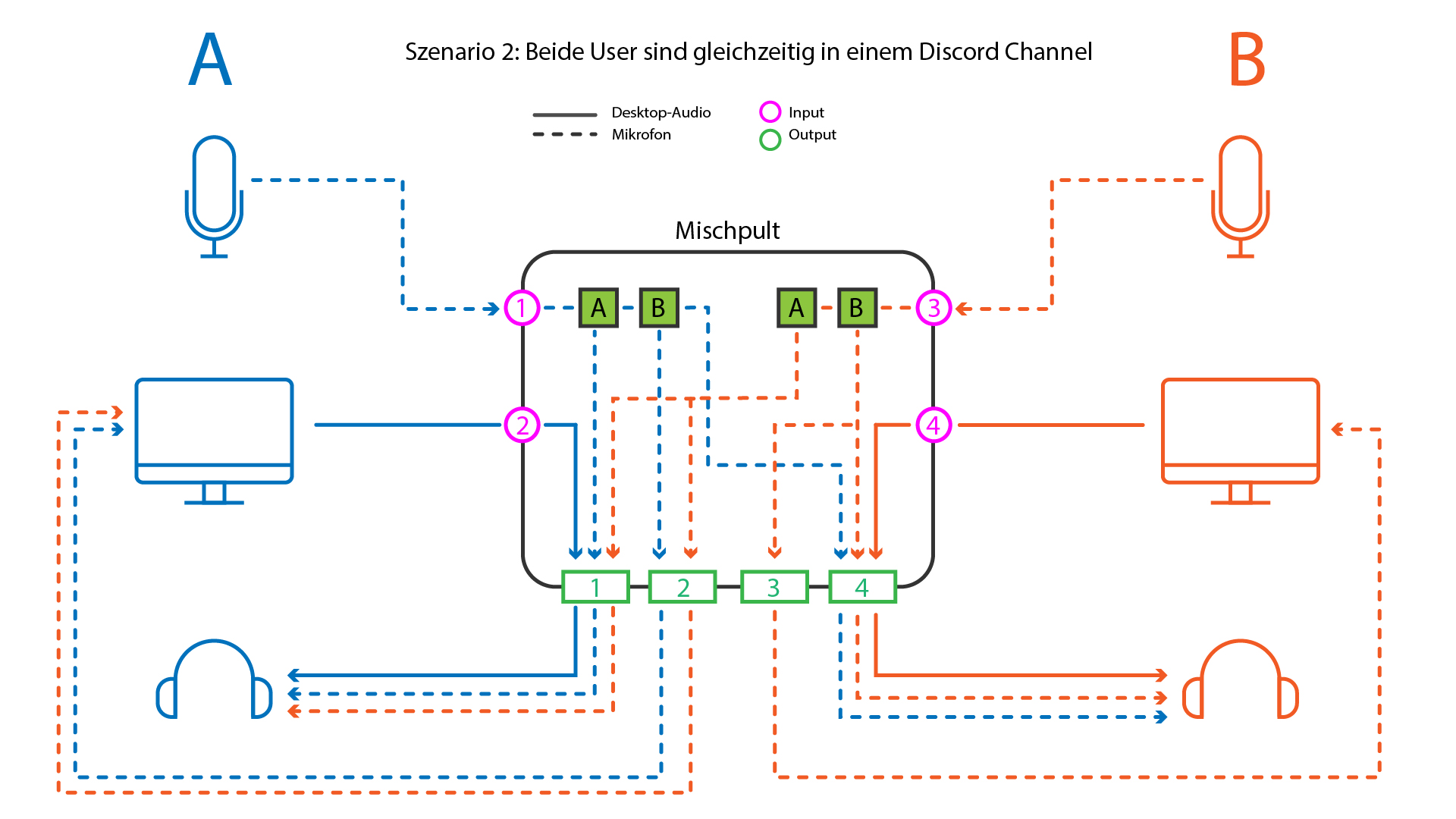 Ich möchte 2 XLR Mikros haben die ins selbe Mischpult laufen, mit Output Optionen für 2 Spuren (A und B). Sprich wenn wir zusammen spielen und miteinander reden könnten wir beide Spuren hören ohne Zeitverzögerung. Im Discord könnten wir uns gegenseitig einfach muten, da wir den Mikrofon Input ja hören und uns so gut verstehen. Zudem wärs dann denke ich das beste wenn unsere beiden Mikro Inputs in meinen PC geht, dort im Voicemeeter in eins gebündelt wird und unsere Mitspieler im Discord dann uns beide nur über einen Account hören. Für Ingame Voicechats könnte trozdem jeder sein Mikro nutzen (z.B. für Lethal Company). Damit würden wir Dopplungen vermeiden wenn beide Mikros mal das selbe aufnehmen sollten (z.B. unsere Katze die meckert^^) . Natürlich würde ich grundsätzlich versuchen das über die Empfindlichkeit so einzustellen dass es nicht vorkommen sollte, jedoch hab ich mein Mikro eigentlich lieber ein wenig weiter entfernt und nicht nen Zentimeter vor meinem Mund und somit auch ein empfindlicher eingestellt.