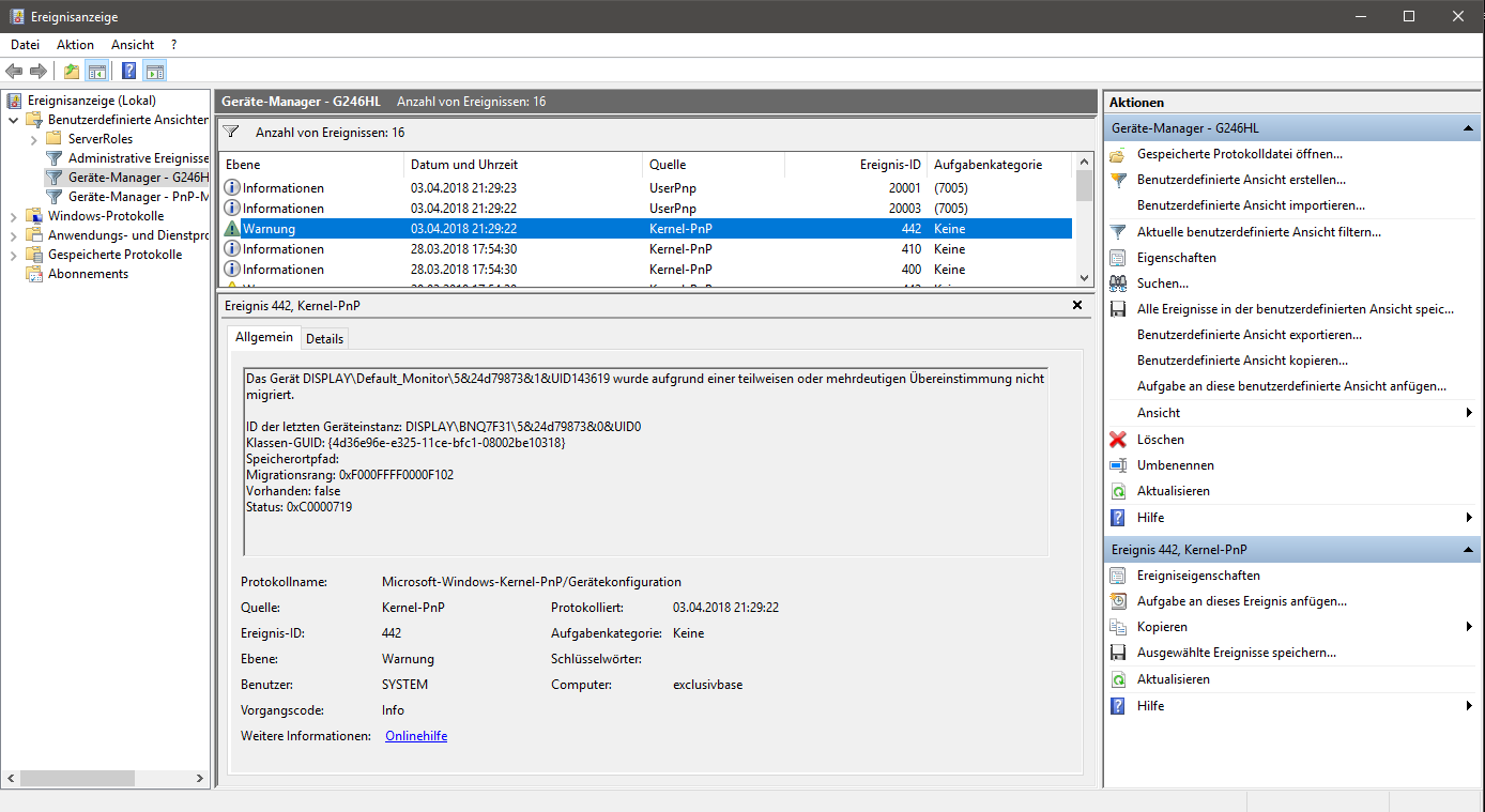 Jetzt habe ich mal bei dem Geräte Manager im Ereignislog geguckt und stellte fest, dass er anscheinend Migrierungsprobleme hat und immer auf die .inf von meinem BenQ XL2411 zu greift...