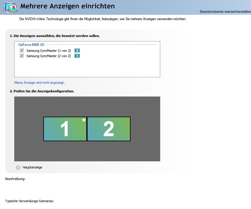 zu meinem problem: ich kann meine anzeige nicht einrichten. in der nvidia systemsteuerung gibts keine wähleinstellung mehr für die bildschirme. habe standard-mäßig dualview, und kanns leider nicht als "großer horizontaler desktop" einstellen. da gibts keinen button! bei nem älteren treiber und meinem alten xp rechner konnt ich da problemlos auswählen zwischen "großer horizontaler desktop, vertikaler desktop, dualview, standalone, etc... . hier gibts die auswahl nichtmehr. ich würd gerne "großer horizontaler desktop" einstellen, wie mache ich das? habe ne 8400 GS/win7 ulti 64bit, und ansonsten genug power im rechner