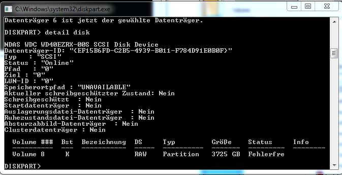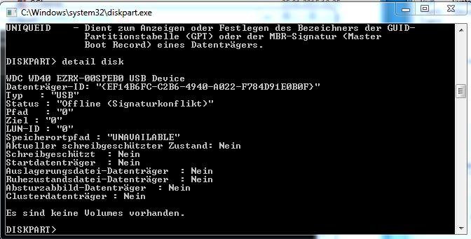 diskpart>detail disk (zeigt u.a. die vorhandene Datenträgerkennung der selektierten Platte n)