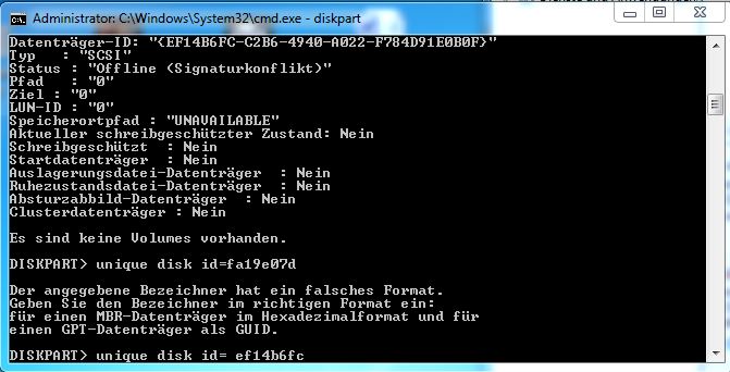 diskpart>uniqueid disk id=hhhhhhhh (acht Hexziffern h: 0-9,a-f als neue ID für die Platte n eingeben)