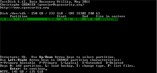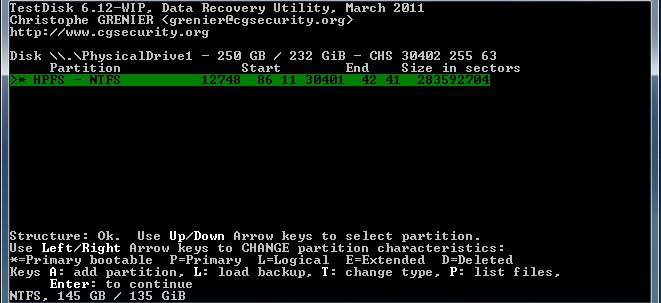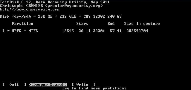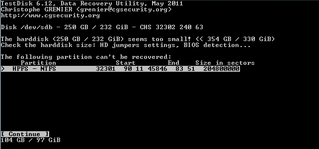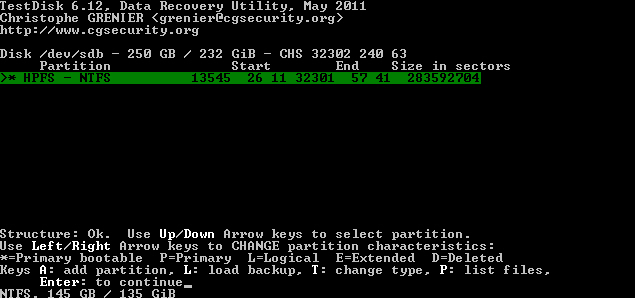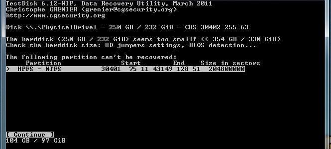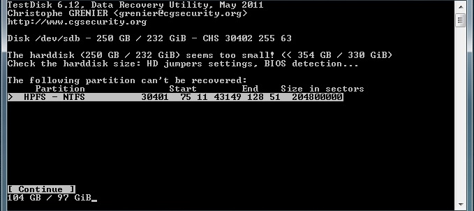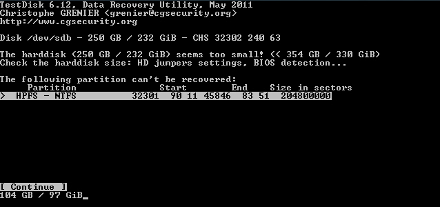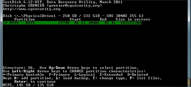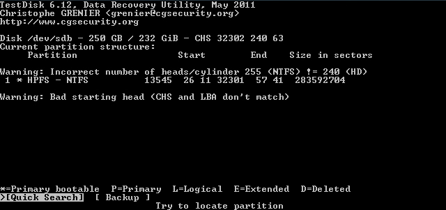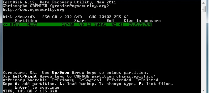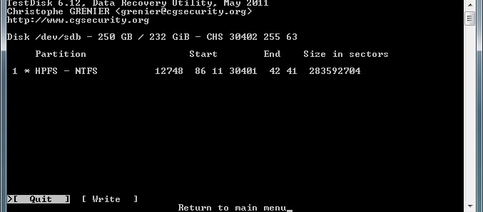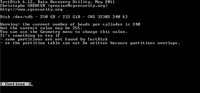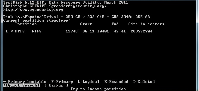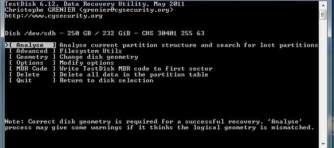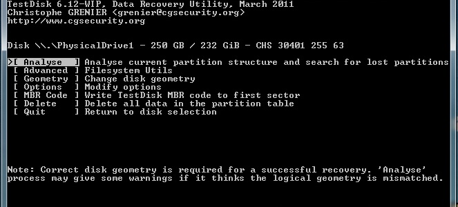 Starte Testdisk bestätige bei dem Log-Datei-Screen mit Enter, wähle deine betroffene Festplatte aus und bestätige mit Enter, bestätige bei Partition Table Typ
