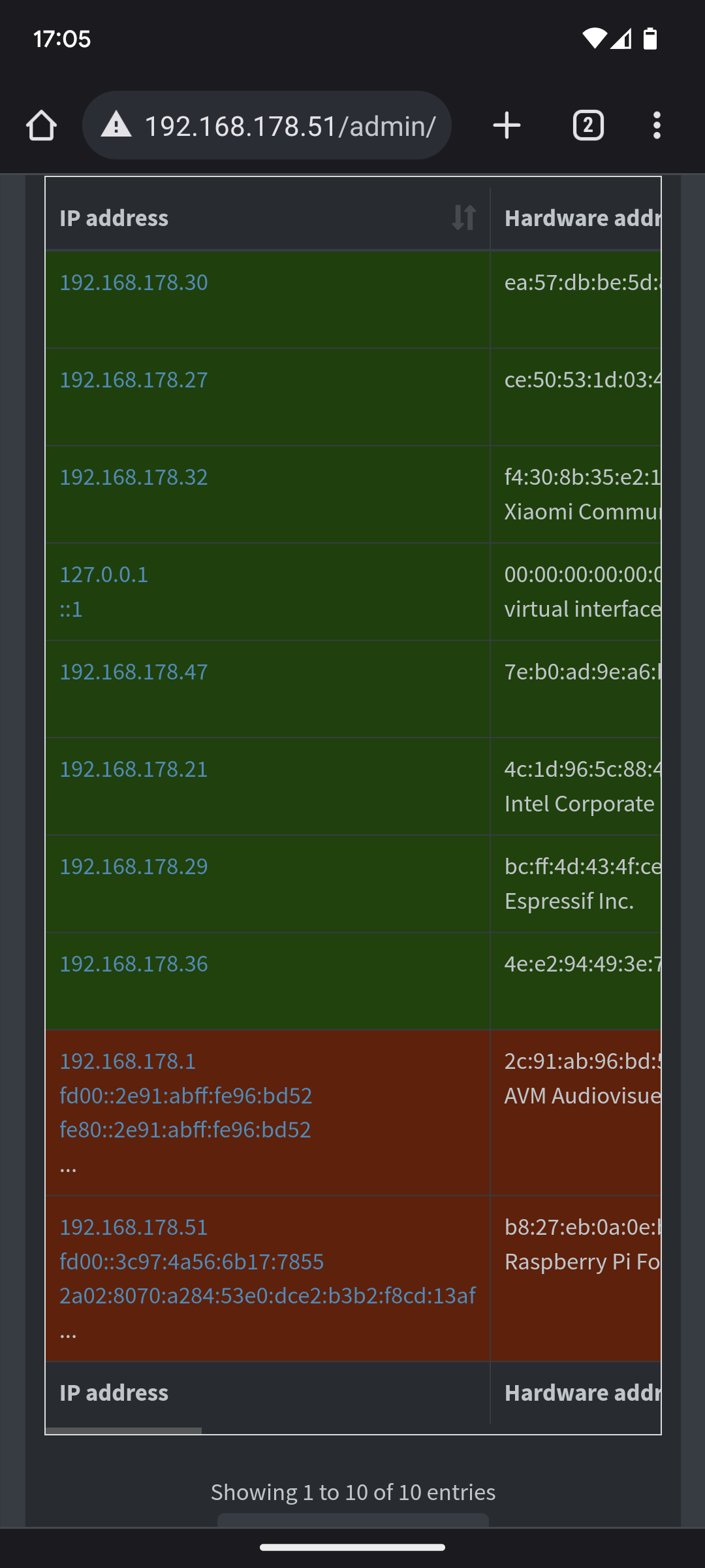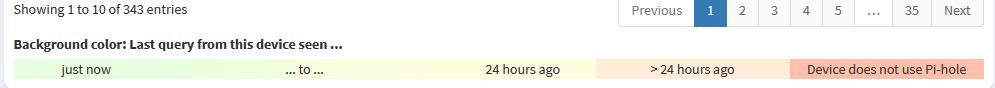 Alles grün (nutzen den pihole) bis auf 2 Geräte (rot = nutzen kein pihole)
