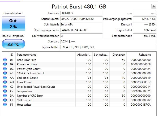 hab mir das Programm Crystaldiskinfo runtergeladen und sehe da bei meiner SSD (die mittlerweile fast 3 Jahre alt ist) den Wert von 2 Prozent, allerdings mit dem Zusatz "Gut"? Muss ich mir sorgen machen? Oder kann man dass noch vernachlässigen? Bis dato hatte ich keine Probleme mit der SSD, läuft wie noch am 1. Tag. Würde mich über Infos freuen. Danke