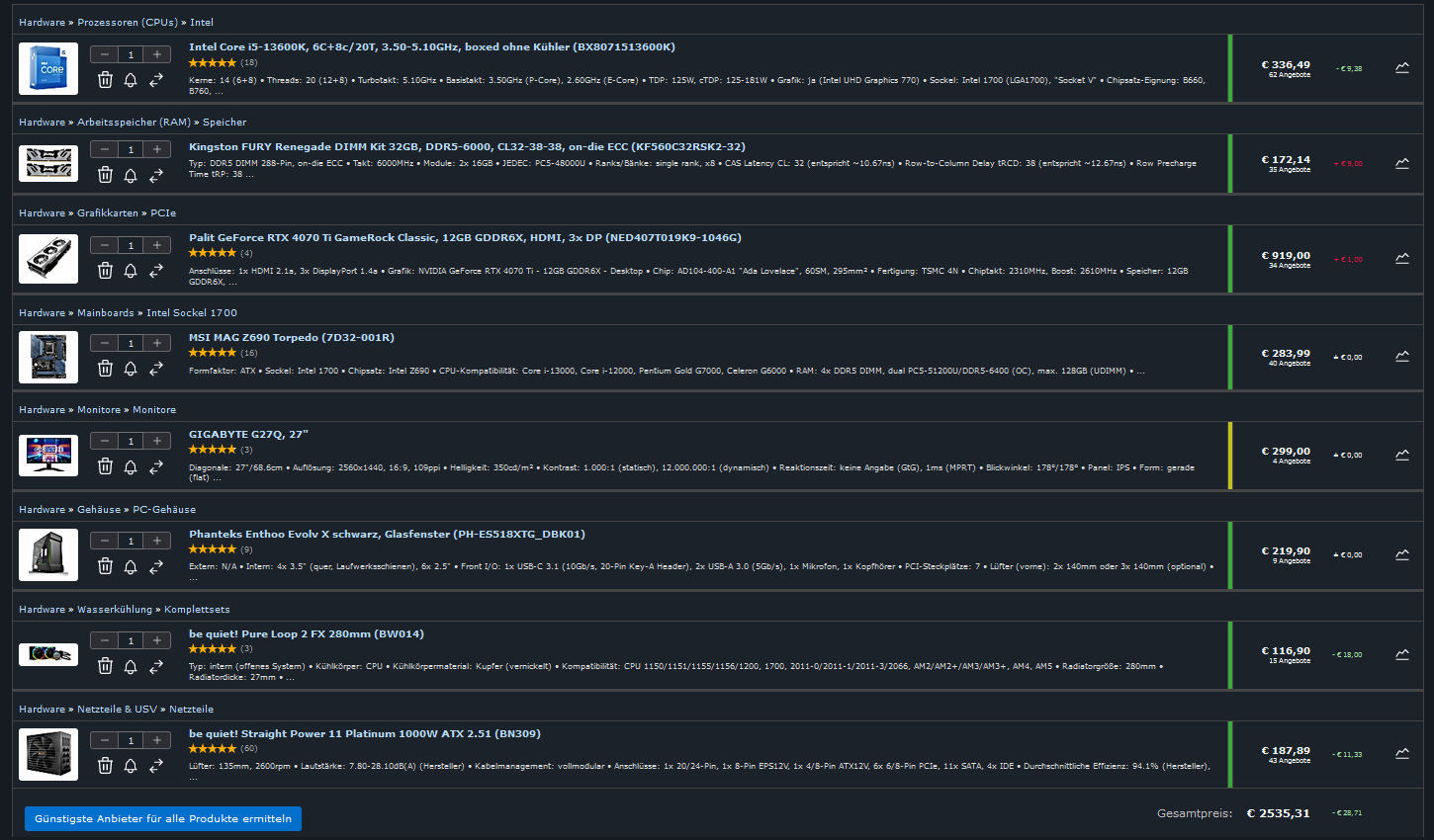 Ich warte deshalb schon 3 Jahre länger als ich eigentlich wollte... Ich wär bereit 1.5k für aktuelle High End Hardware auszugeben, aber das ist naives Wunschdenken. Ich vergleiche schon fast täglich auf Geizhals und komme mir lächerlich vor, wie ein Börsenspekulant oder so was. Ich häng mal ein Bild von meiner aktuellen Zusammenstellung an.