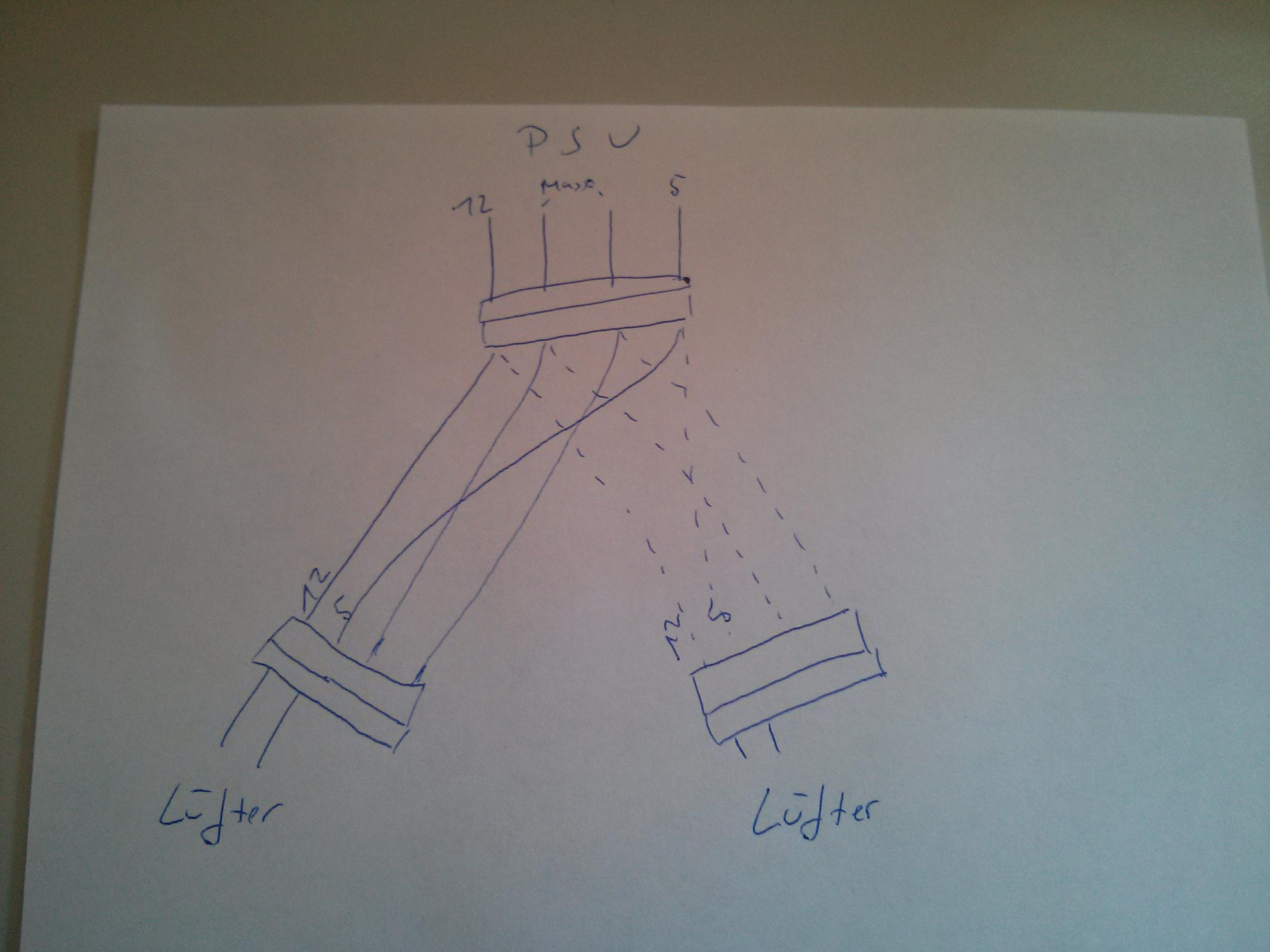 Hallo zusammen, ich hab heute morgen nen Office Rechner zusammengebaut und will die mitgelieferten Lüfter (12V) mit 7 Volt laufen lassen. Dazu habe ich ein molex y-kabel entsprechend modifiziert (also kabel so getauscht, dass sich eben die 7V Potentialunterschied ergeben). Jetzt steh ich nur vor folgendem (für mich grad irgendwie unverständlichem ^^) Problem. Ich schließe den y-Stecker an ein molex 4 Pick stecker vom Netzteil (bequiet system power7) an, und dann zunächst ein lüfter -> funktioniert -> PC wieder ausgemacht -> 2 Lüfter -> PC geht nicht an -> 1 Lüfter -> PC läuft wieder... woran kann es liegen, dass der PC nicht angeht wenn 2 Lüfter angesteckt sind? Gibts da irgendeine Erklärung, evtl. im Zusammenhang mit der 7V schaltung (weil ja keine Masse mehr geschaltet ist?) ?