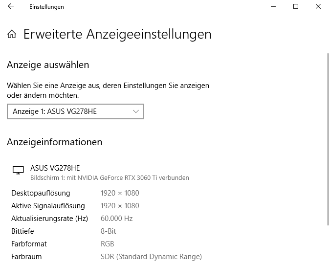 Monitor 1 ist ein ASUS VG278HE mit HDMI verbunden.