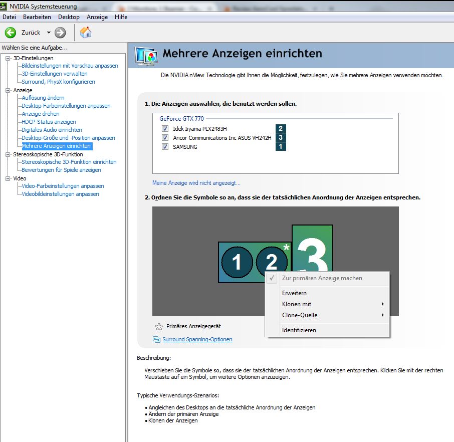 Ich habe die GTX770, 2 Monitore von LG mit 2560*1080 und einen Beamer mit 1920*1080 dran. Ich möchte gerne, dass einer der beiden Monitore der Hauptmonitor ist, der zweite Monitor eine Erweiterung dessen und der Beamer wahlweise das Bild von einem der beiden Monitore klont. Das Einzige, was mir bisher gelungen ist, ist die Erweiterung zu klonen oder alles zu erweitern. Bin ich zu blöd oder geht das, was ich möchte, nicht?