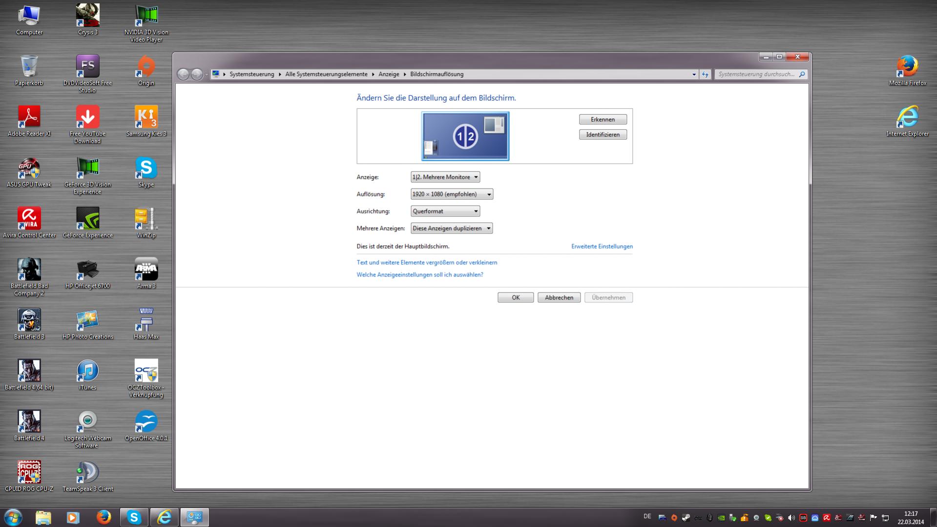 Habe eine frage habe 2 Monitore 27" .Moechte sie an einer Grafikkarte Asus GTX770 betreiben,so das ich auf dem einen Gamen kann ,und auf dem anderen Surfen kann zugleich.Kann mir jemand von euch vielleicht erklaeren wie das am einfachsten geht. Habe den einen am DVI den anderen HDMI angeschlossen.