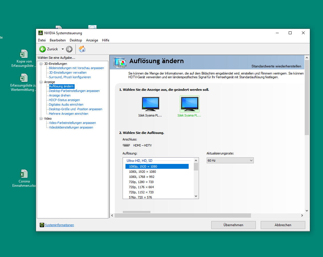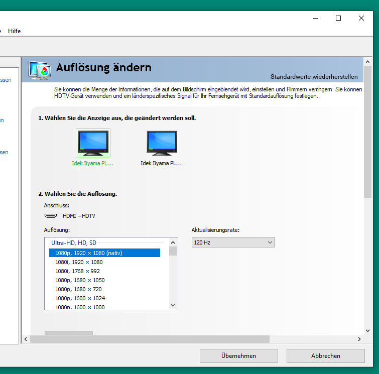 An einem Client laufen beide Monitore mit maximal 120 Hertz und mit einer Auflösung von Ultra HD 1080, 1920 x 1080 (nativ).