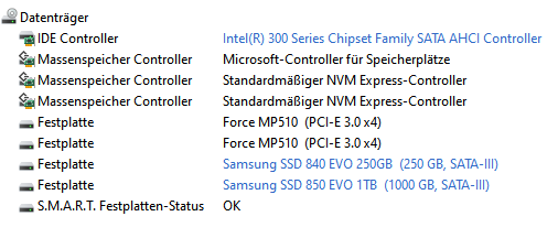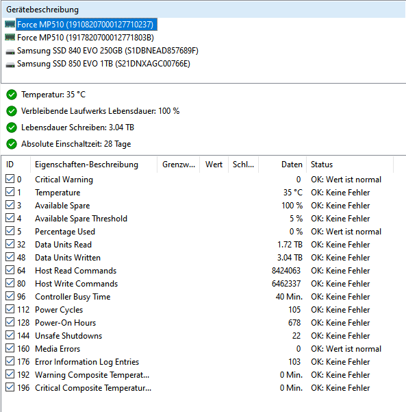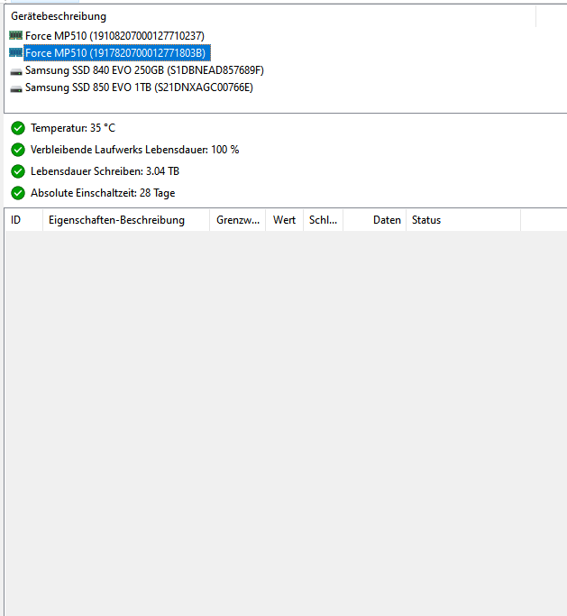Habe mir eine 2. MP510 960gb gekauft. Nun ist das Problem das Aida64 unter Sensoren nur eine erkennt und bei denn SMART Werten werden zwar beide angezeigt aber nur eine kann ausgelesen werden. Andere Tools wie CrystalDiskInfo erkennen beide. Jetzt kann man sagen dann hat Aida64 ein Problem, merkwürdig finde ich es dennoch. Beide Modelle haben eine unterschiedliche Firmware falls relevant.