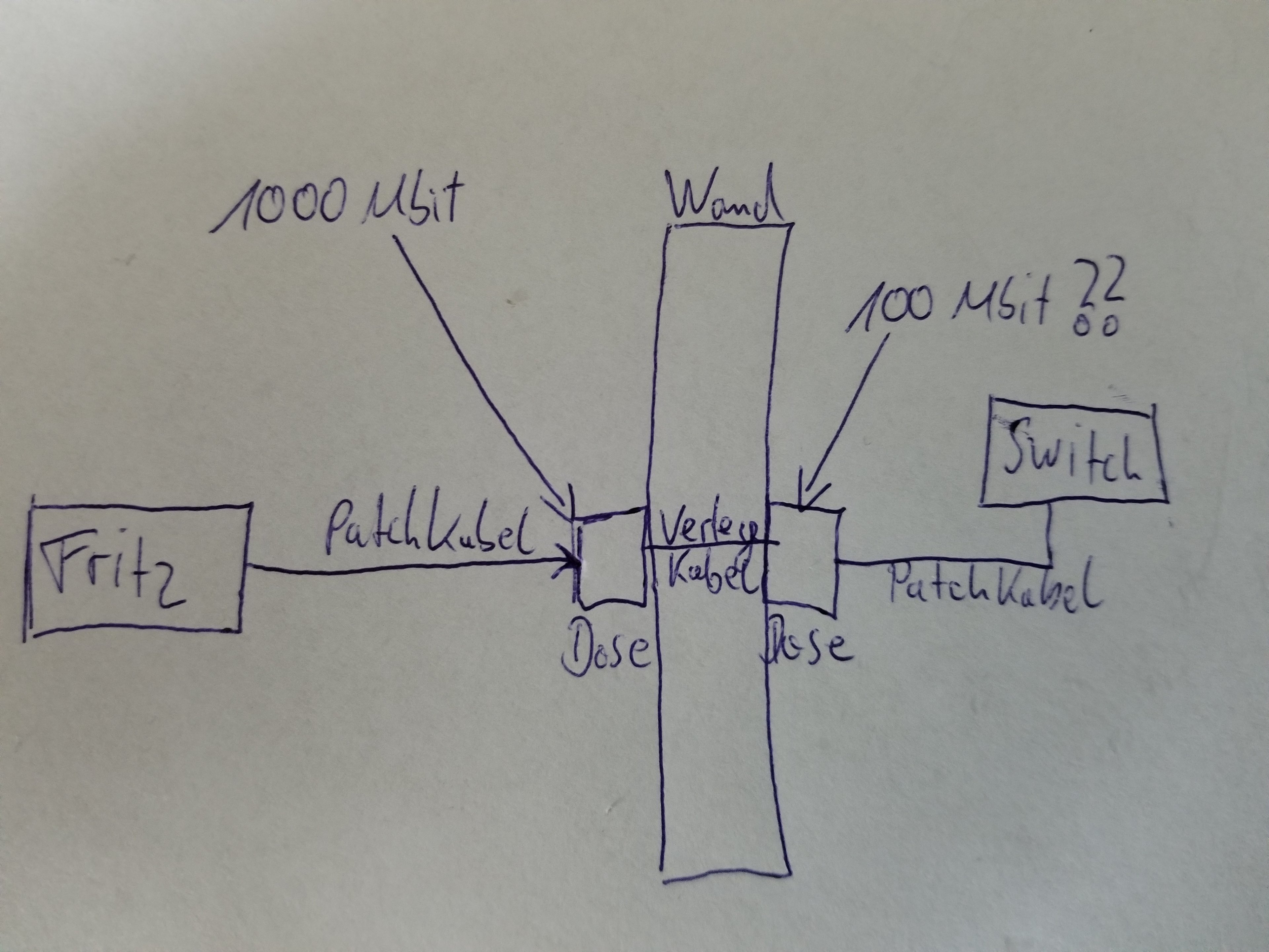 Hallo liebe Schwarmintelligenz :-) Ich habe zuhause in meinem Netzwerk seit neuestem Gigabit-Internet, und musste feststellen daß die aber an einer bestimmten Stelle verloren gehen und nur noch 100Mbit weitergereicht werden. Ich gehe von einem Raum in den anderen durch eine Wand durch, indem ich auf beiden Seiten eine Netzwerdose installiert habe die über ein 8-adriges Verlegekabel miteinander verbunden sind. Auf der einen Seite geht ein Patchkabel von der Fritzbox mit 1000Mbit rein aber aus der Dose auf der anderen Seite kommen nur 100Mbit aus der anderen Dose raus. Das Kabel daß die Dosen verbindet ist nur 30cm lang und alle 8 Farben und Adern sind ordentlich aufgelegt. Ist das normal daß das nicht geht ? HAb mal nen krakelige Zeichnung gemacht zum besseren Verständnis......