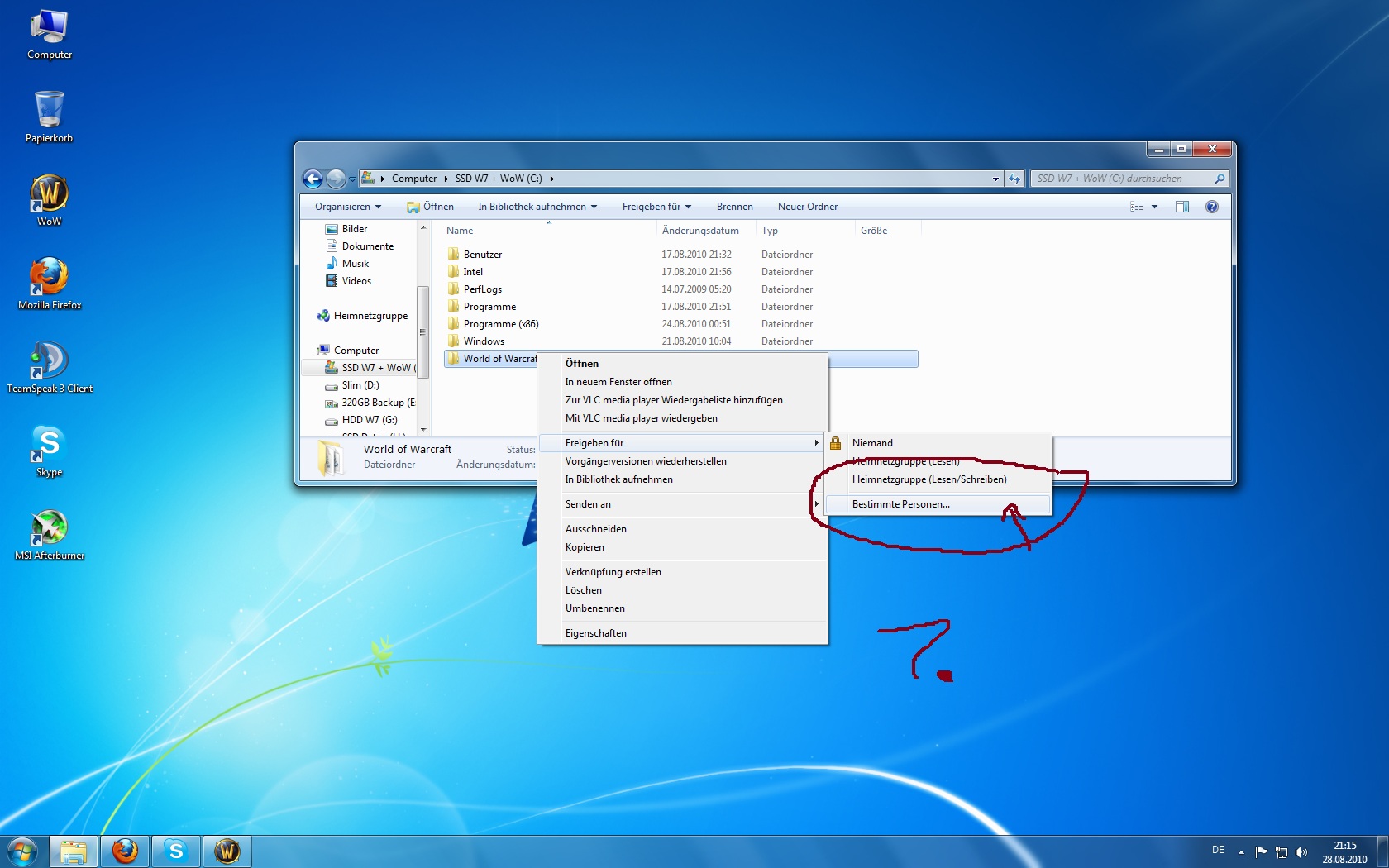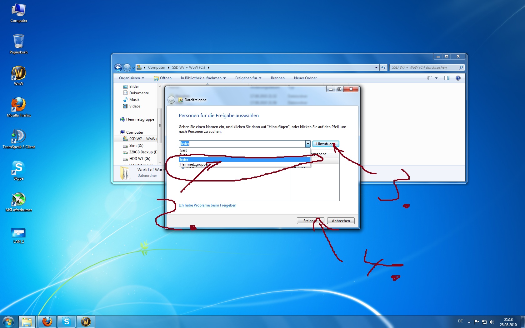 ich habe ein Problem mit dem Kopieren von Dateien im Netzwerk. Habe schon etliche Themen und Anleitungen gelesen, aber es klappt nicht. Ich habe im Netzwerk 2 PC`s mit Windows 7 Ultimate, ein Rechner (LAN) und ein Laptop (WLAN). Nun möchte ich gerne Auf jedem Rechner ein Ordner freigeben, so dass ich in beide Richtungen die Dateien sehen kann und auch kopieren kann. Es hat früher mal geklappt, allerdings sehr langsam 450kb/s. Nun sehe ich beide Rechner in der Netzwerkumgebung kann aber nicht drauf zugreifen.