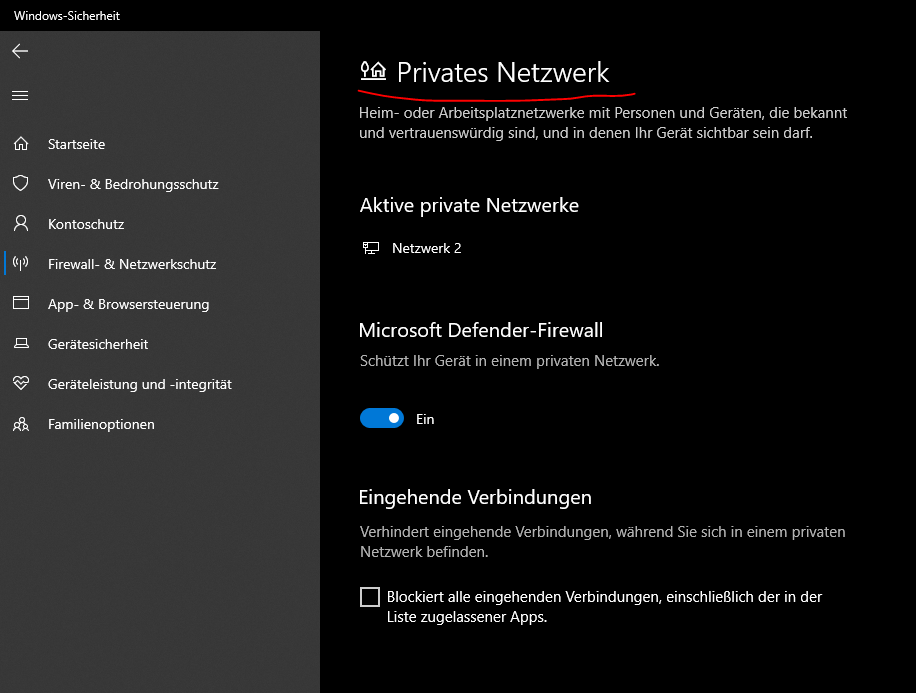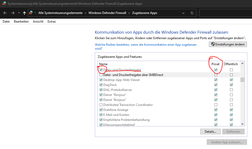 Dort dann kontrollieren, ob der Haken für die Datei- und Druckerfreigabe für privates Netzwerk auch gesetzt ist und ggf setzen und speichern - siehe meine ersten Screenshots bzgl Firewall.