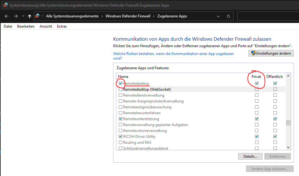 Dort den Haken rein bei Datei- und Druckfreigabe bei dem Netzwerk in dem du bist (also privat oder Domäne, falls der Rechner in einer ist) und Remoptedesktop.