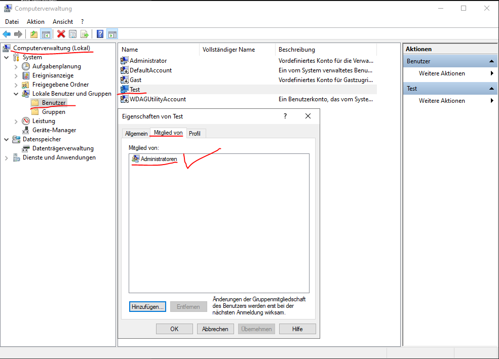 Computerverwaltung, neuer Benutzer David1, Admin, Haken, ok, Rechtsklick auf David1 in der Liste, PW david2, bestätigen david2.