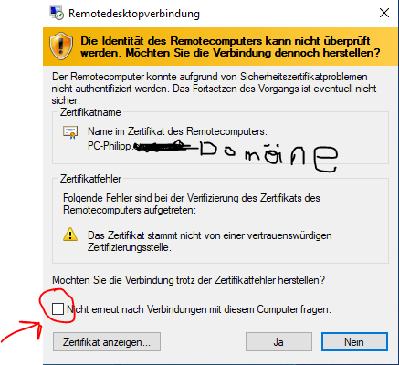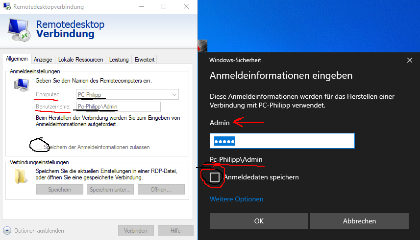 Screenshots meines Remotezugriffs vom Test PC aus auf meinen PC (Pc-Philipp) der in einer Domäne ist, ich aber auf den lokalen Benutzer (kein Domänenbenutzer) Admin zugreife.