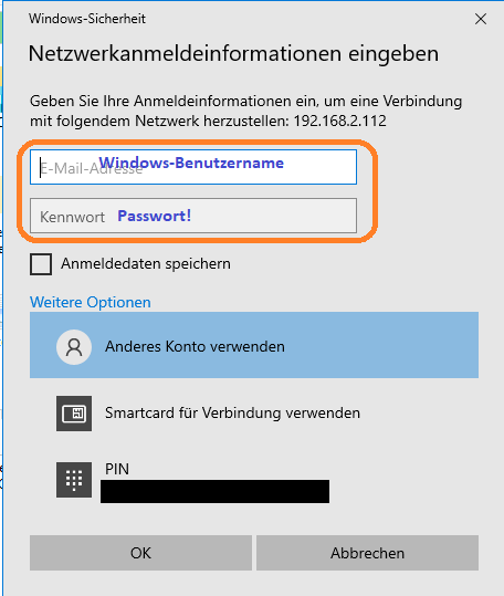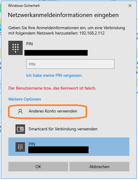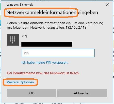 Und die "Weitere Optionen" bei der "Netzwerkanmeldung" ausprobiert? Kommt da keine Möglichkeit, einen Benutzer u. Passwort einzugeben?