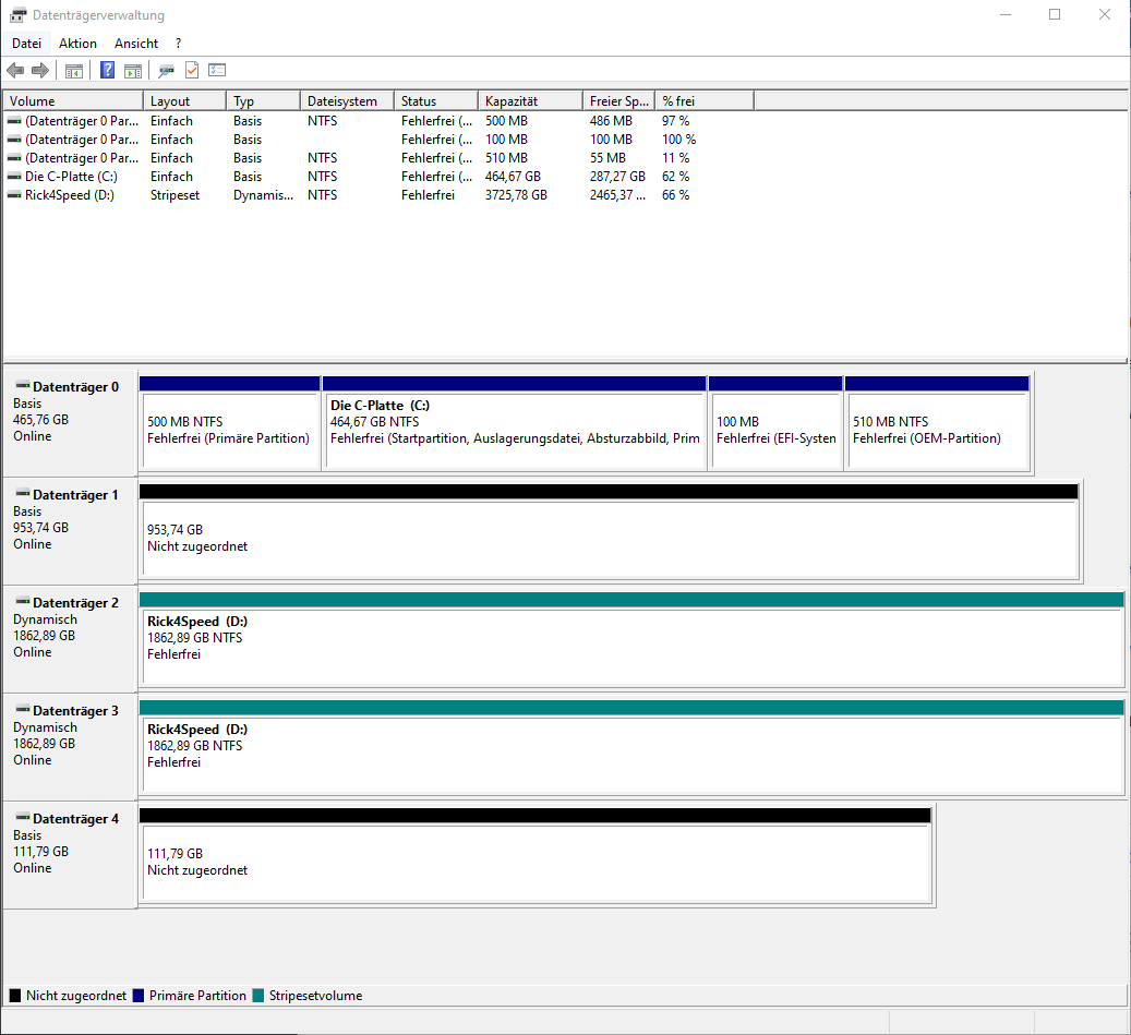nachdem ich vor kurzem meine Haupt-SSD durch eine Corsair MP510 960 GB ersetzt habe, wäre eine 500 GB SATA-SSD übrig. Mein Datengrab ist eine 1 TB SATA-SSD, die gerade mal noch ~20 GB frei hat. Meine Idee wäre nun, unter Windows diese beiden SATA-SSDs zu einer 1,5 TB großen als Windows Speicherpool zusammenzufassen. 2 einzelne Partitionen möchte ich nicht, weil das Hantieren mit Bilder, Videos, Musik, usw. verteilt über diese beiden Partitionen einfach ungeschickt ist.