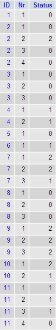 sobald eine 0 gefunden wird, gibt er die ID aus. Super. Für b) kann ich aber leider nicht sagen WHERE `Status` <> '0', hier gibt er IDs zurück, wo durchaus eine 0 vorkommt, zB bei ID 11, da Nr 1-3 eine 1 haben, aber 4 eine 0.