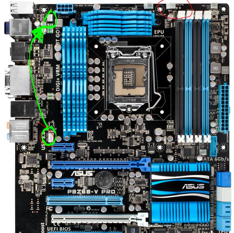 Ich habe diese Karte aufs Mainboard gesteckt und es dreht der dritte Lüfter rechts nicht. Wo muss dieser abstehende Lüfterkabel(?) hin? Aufs Mainboard oder ans Netzteil?
