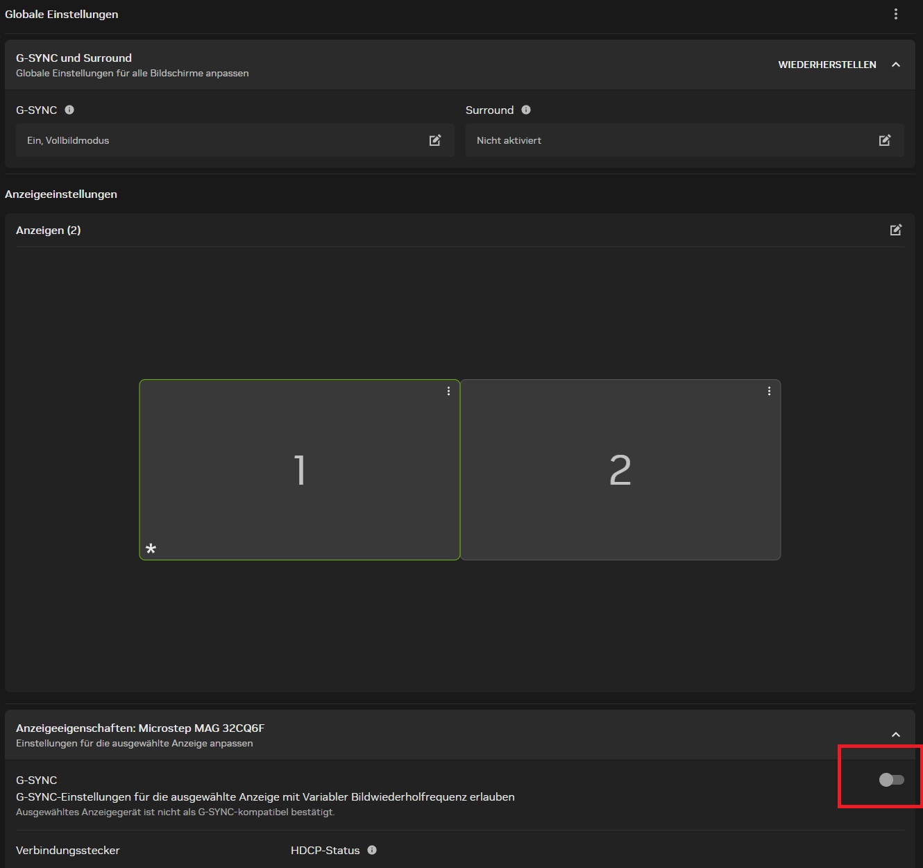 Fehler gefunden, ich hab es unten nochmal separat aktivieren müssen - jetzt flackert auch die Anzeige vom Monitor :-)