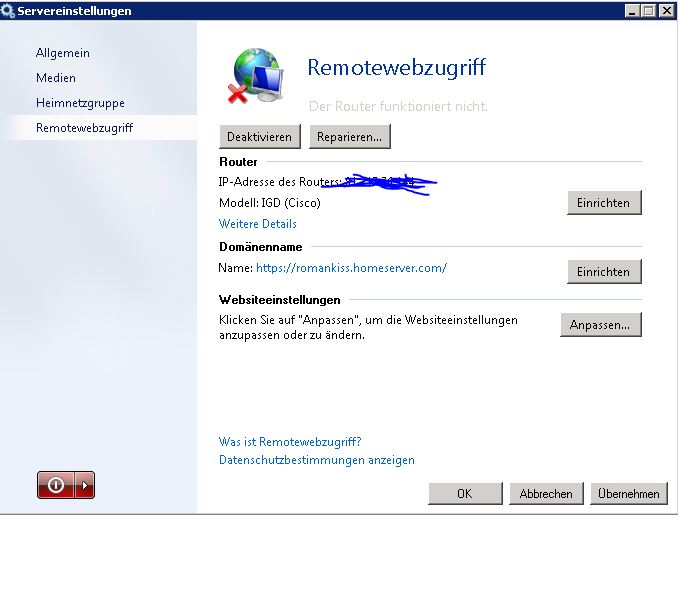 WHS findet zwar den Routerm, zeigt auch die IP an aber Remotewebzugriff lässt sich nicht aktivieren wie vorher,