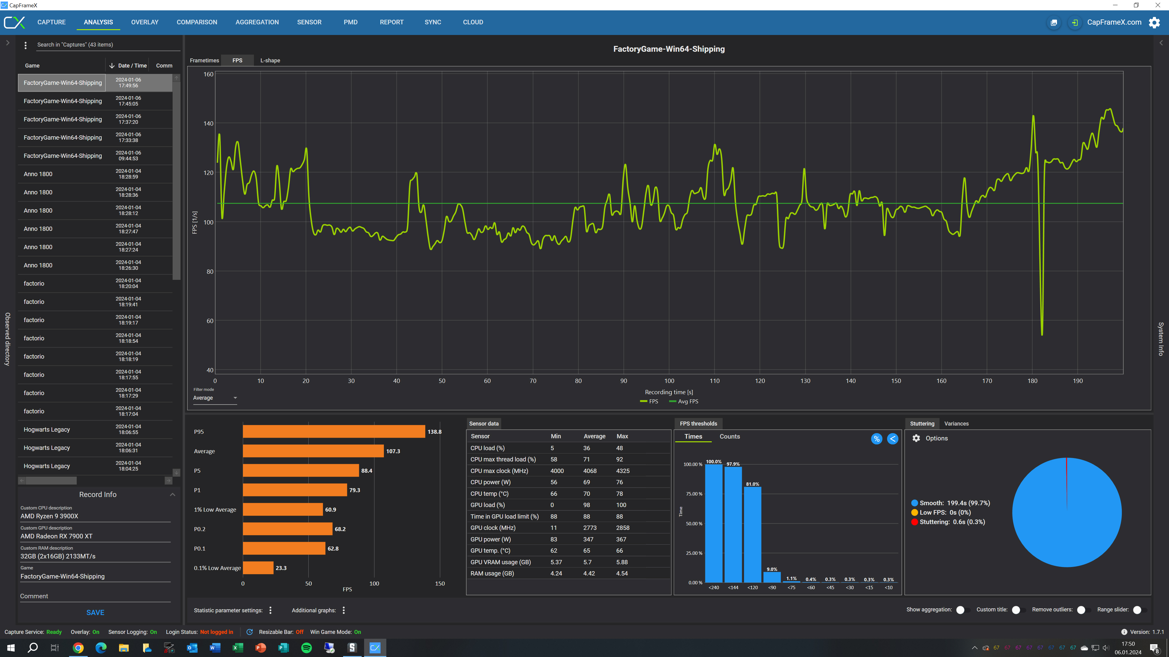 Hier der erste Screenshot (Satisfactory, 200 Sekunden Aufnahme, Grafikkartenlüfter laufen auf Hochtouren, Karte recht laut):