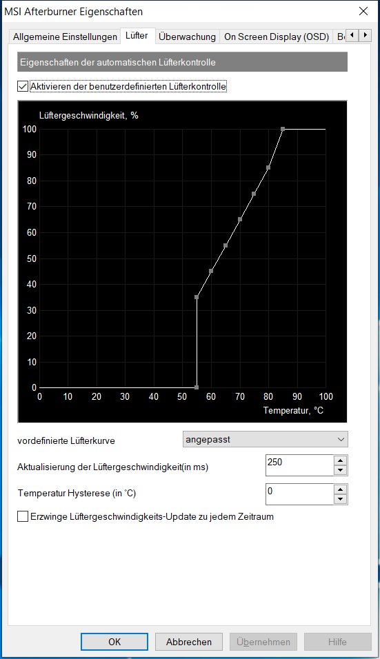 Leider habe ich mit einer Rechteckkurve das gleiche Problem. Es scheint auch einfach so zu sein, dass er Lüfter, sobald er los dreht, erst einmal viel mehr Drehzahl macht als er soll. Die Grafikkarte beschleunigt die Lüfter erst einmal auf ca. 1.500 U/min.