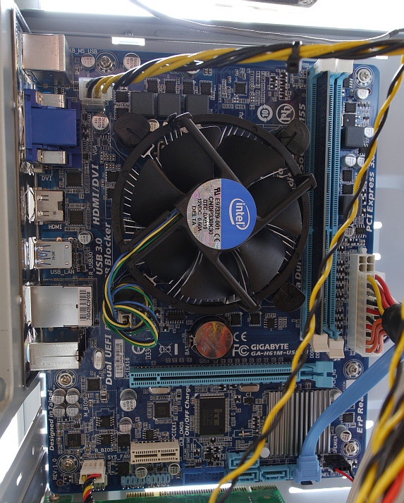 Das neue Mainboard ist das GA-H61M-USB3H von Gigabyte. Als Netzteil befindet sich im Gehäuse noch ein be quiet BQT P4-400W-S1,3 - Netzteil. Das dicke, schwarze Hauptstromkabel hat am Ende einen 20poligen Stecker, dieser passt auch aufs Mainboard, jedoch bleiben vier Pole frei.