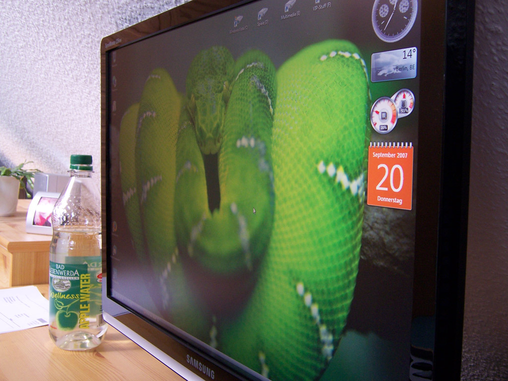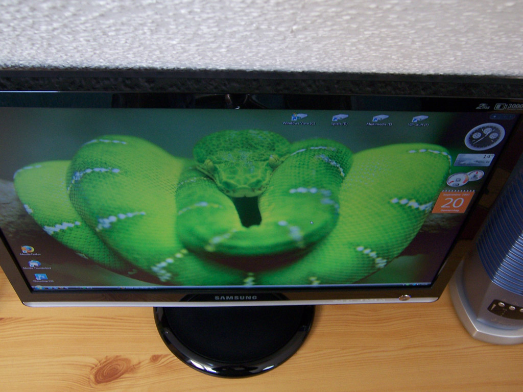 Dennoch, ich habe drei Aufnahmen meines Samsung 226BW gemacht. Den habe ich erst letzte Woche gekauft, obwohl ich mir auch geschworen habe, irgendwann auf ein "antständiges" Panel umzusteigen. Leider kann ich keinen tollen Vergleichsmonitor daneben stellen, soll aber auch erstmal nur um die Blickwinkel gehen. Und die sind bei weitem nicht so schlecht, wie manche sie gerne reden. Sicher, es verzieht sich teils ins Gelbe etc pp, aber dass man nichts mehr sehen könne, wenn man seinen Kopf dreht, ist Quark. Wenn man aufsteht, kann man auch noch alles erkennen.