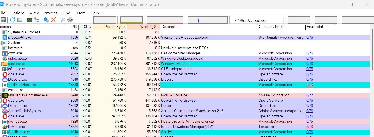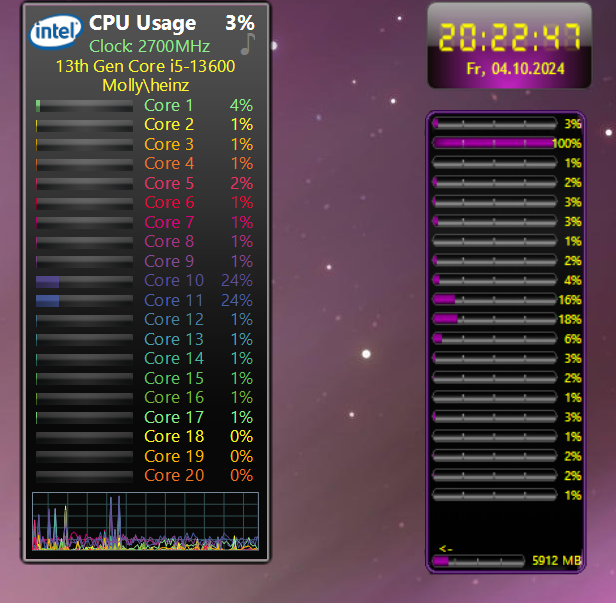 Einer der 20 Kerne wird in einem Gadget (CoreMeter aus 8GadgetPack) fast immer mit 100% angezeigt. Im Taskmanager sieht es nicht auffällig aus, siehe Screenshot. Das war davor mit 23H2 nicht so, und jetzt bin ich auf der Suche, woran das liegen könnte.