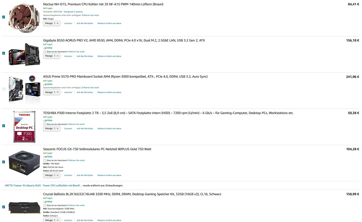 Alle Komponenten möchte ich bei Amazon bestellen, da ich dort noch viel Guthaben habe.